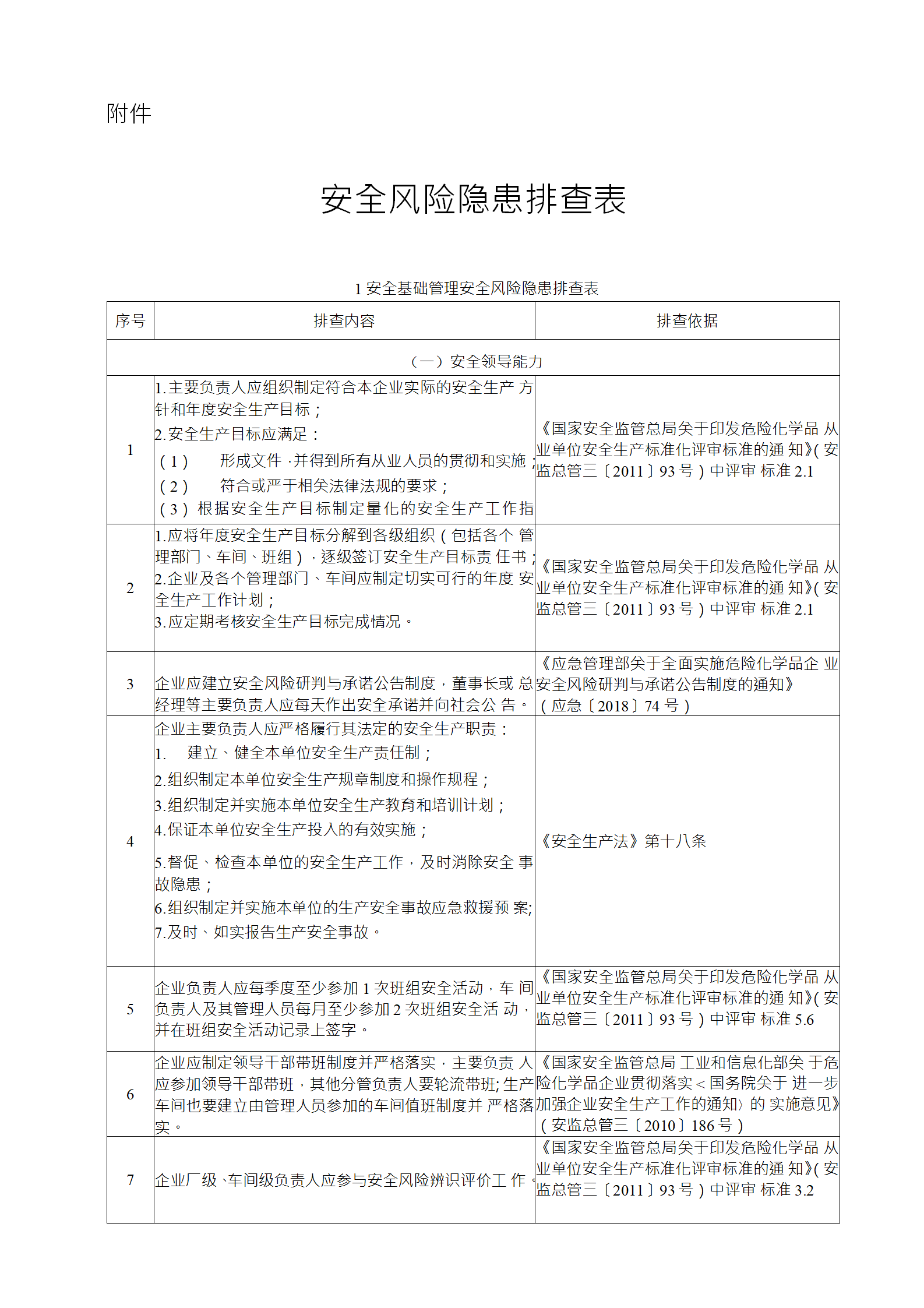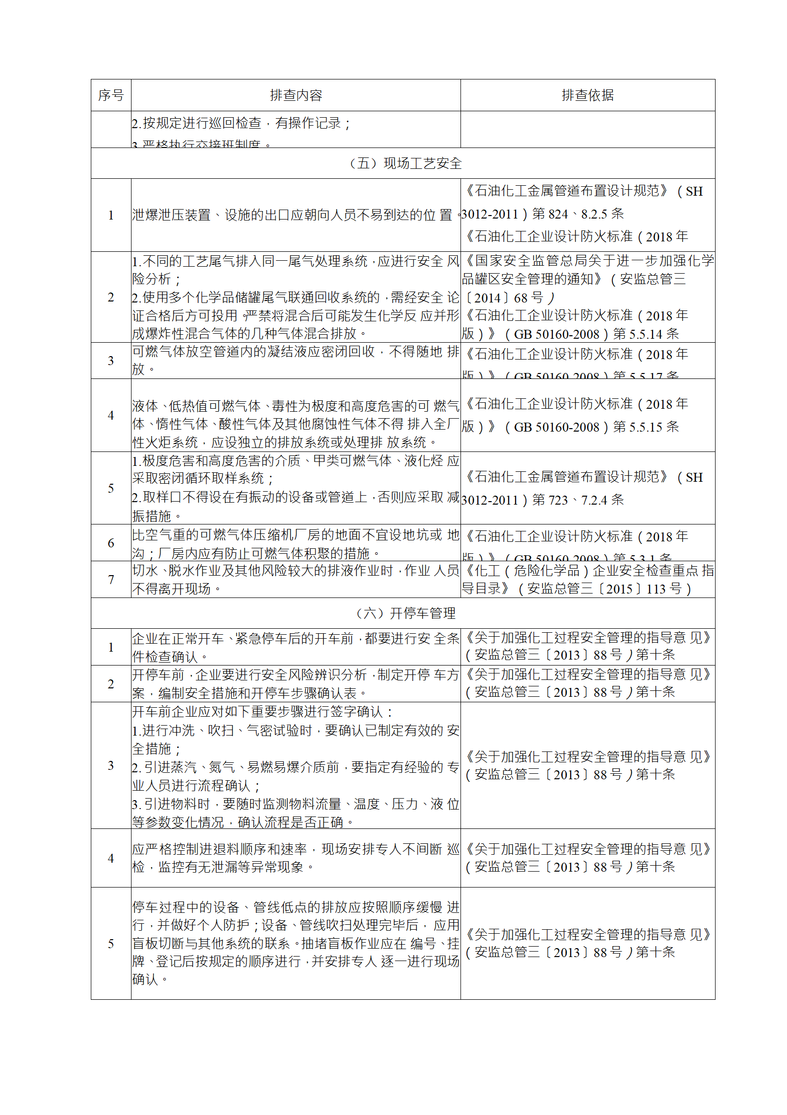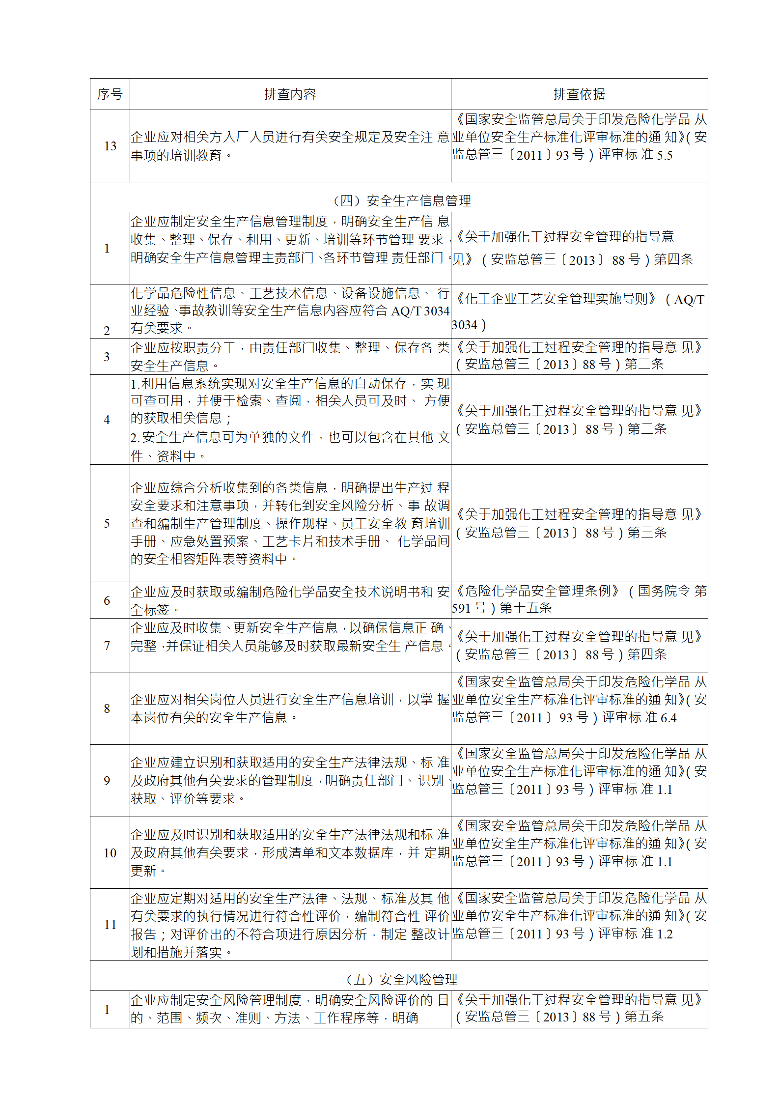 企業(yè)應(yīng)結(jié)合自身安全風(fēng)險(xiǎn)及管控水平,按照化工過(guò)程安全 管理的要求,參照各專業(yè)安全風(fēng)險(xiǎn)隱患排查表(見(jiàn)附件),編制 符合自身實(shí)際的安全風(fēng)險(xiǎn)隱患排查表,開(kāi)展安全風(fēng)險(xiǎn)隱患排查 工作。