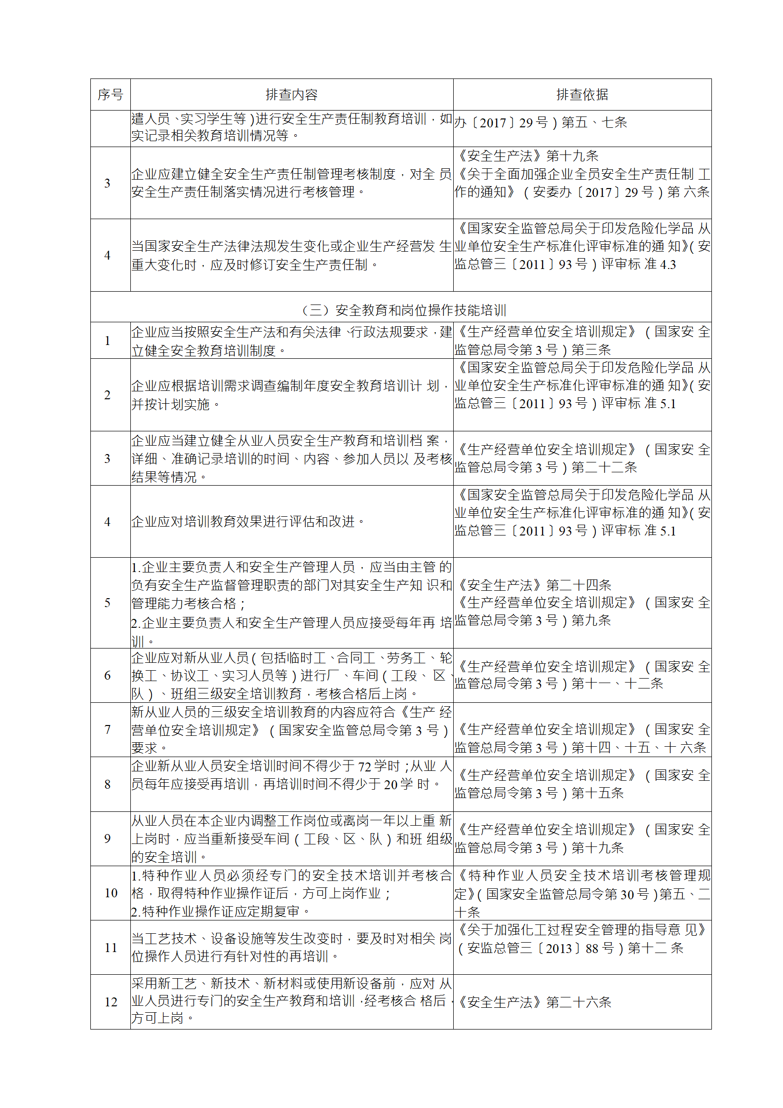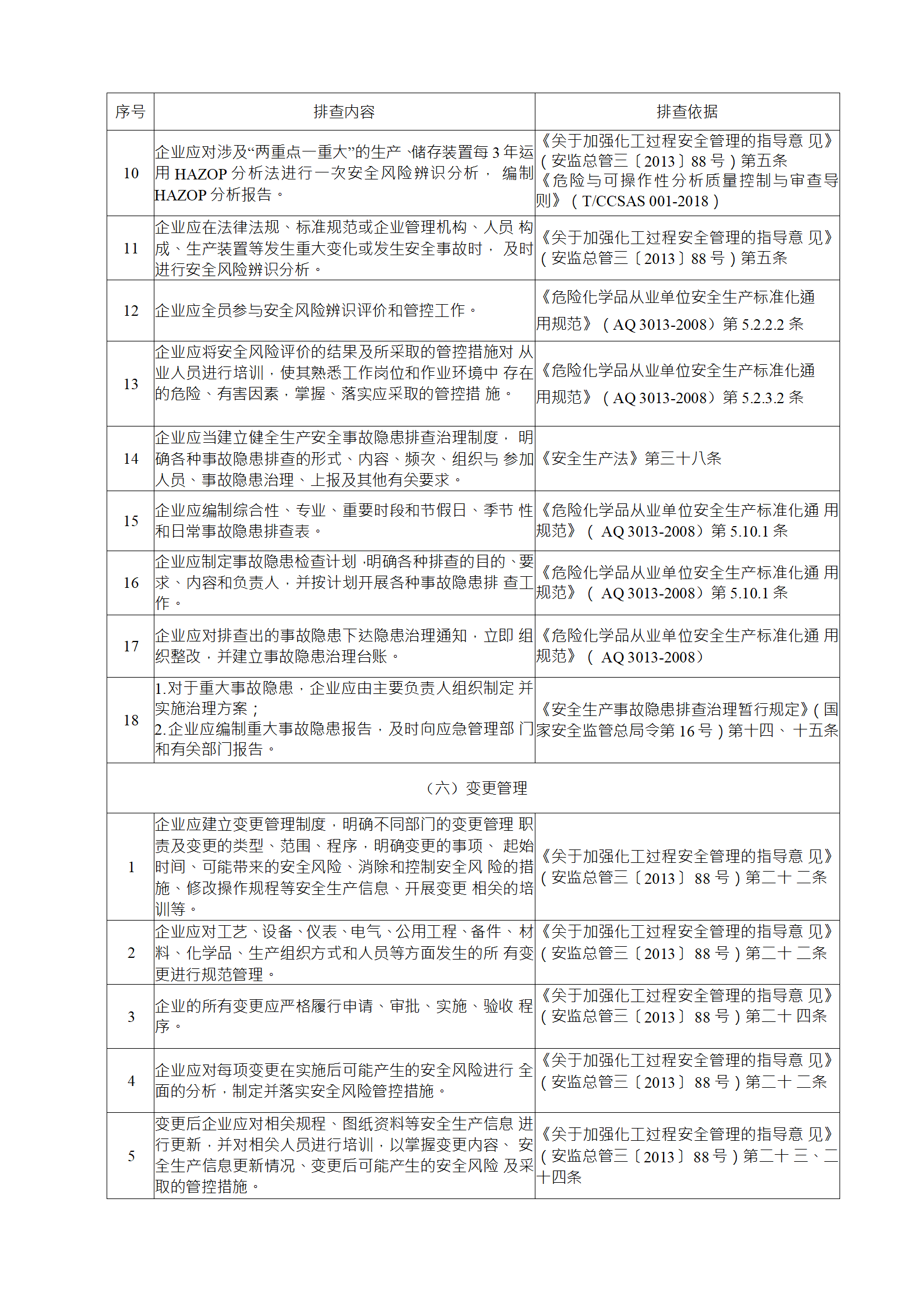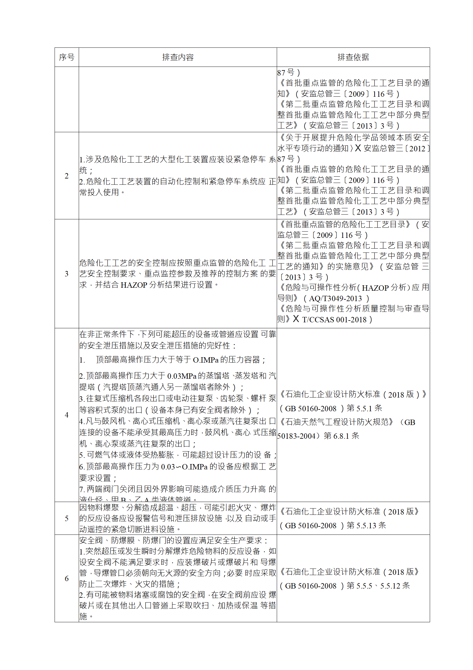 (2)綜合性排查是指以安全生產(chǎn)責(zé)任制、各項(xiàng)專業(yè)管理制 度、安全生產(chǎn)管理制度和化工過(guò)程安全管理各要素落實(shí)情況為重點(diǎn)開(kāi)展的全面檢查;