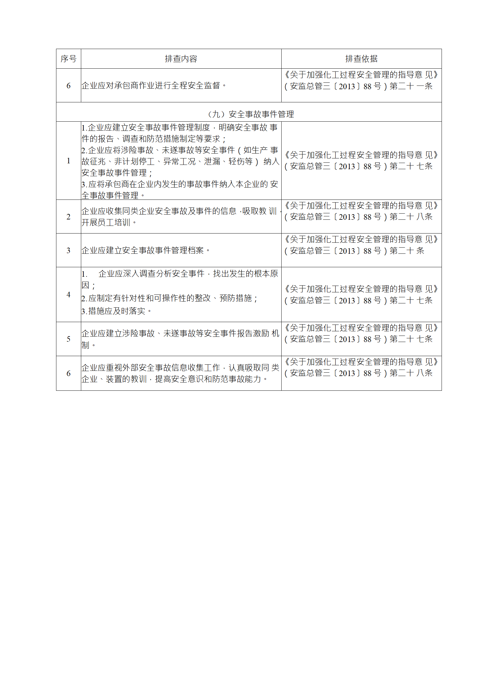 3.1.1 企業(yè)應(yīng)根據(jù)安全生產(chǎn)法律法規(guī)和安全風(fēng)險(xiǎn)管控情況, 按照化工過(guò)程安全管理的要求,結(jié)合生產(chǎn)工藝特點(diǎn),針對(duì)可能發(fā)生安全事故的風(fēng)險(xiǎn)點(diǎn),全面開(kāi)展安全風(fēng)險(xiǎn)隱患排查工作,做 到安全風(fēng)險(xiǎn)隱患排查全覆蓋,責(zé)任到人。