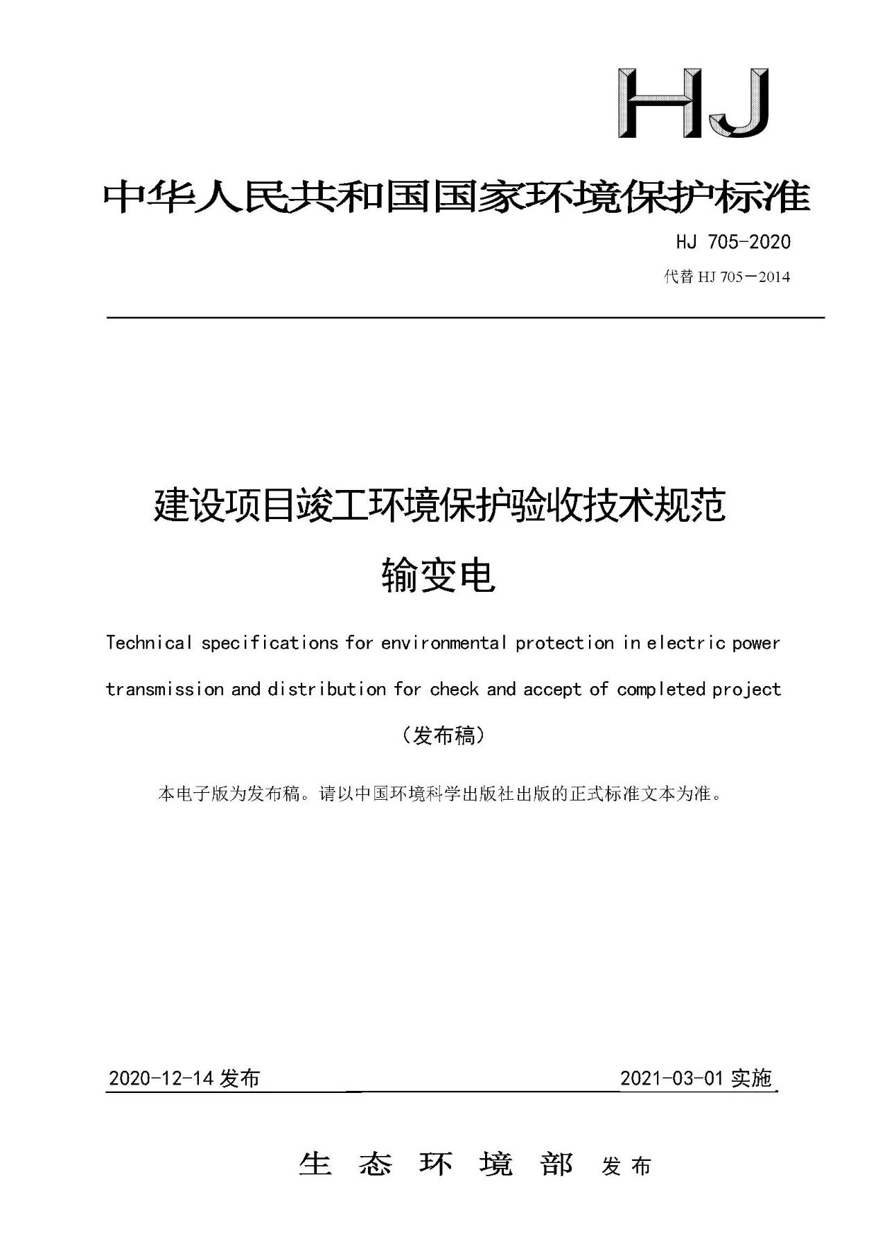 自上述標準實施之日起,《環(huán)境影響評價技術導則 輸變電工程》(HJ 24-2014)、《建設項目竣工環(huán)境保護驗收技術規(guī)范 輸變電工程》(HJ 705-2014)廢止。