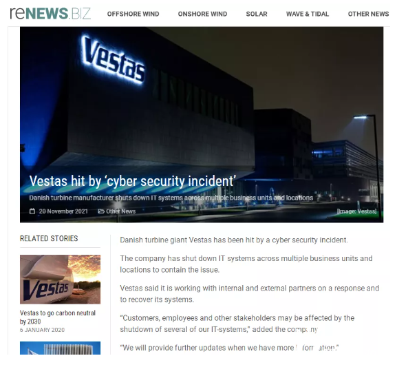 據(jù)外媒報道,11月20日維斯塔斯遭遇網(wǎng)絡安全事故,目前已經(jīng)關(guān)閉多個業(yè)務部門和地點的信息技術(shù)系統(tǒng),以控制這一問題。