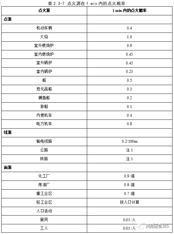 根據(jù)《危險(xiǎn)化學(xué)品生產(chǎn)裝置和儲(chǔ)存設(shè)施外部安全防護(hù)距離確定方法》(GB/T 37243-2019),典型點(diǎn)火源分為:a)點(diǎn)源,如加熱爐(鍋爐)、機(jī)車、火炬、人員;根據(jù)化工園區(qū)情況,點(diǎn)火源主要為人員靜電、違章動(dòng)火、電氣設(shè)施、雷擊、機(jī)動(dòng)車輛、使用工具(鐵質(zhì))不當(dāng)產(chǎn)生火花以及外來火源等。根據(jù)《化工企業(yè)定量風(fēng)險(xiǎn)評價(jià)導(dǎo)則》(AQ/T 3046-2013)附錄G,立即點(diǎn)火概率與裝置類型、物質(zhì)種類及泄漏(釋放)有關(guān),固定裝置可燃物質(zhì)泄漏后,立即點(diǎn)火概率見下表。延遲點(diǎn)火的點(diǎn)火概率應(yīng)考慮點(diǎn)火源特性、泄漏組分以及點(diǎn)火源處于蒸氣云團(tuán)內(nèi)的概率,不同點(diǎn)火源在1min內(nèi)的點(diǎn)火概率見下表。