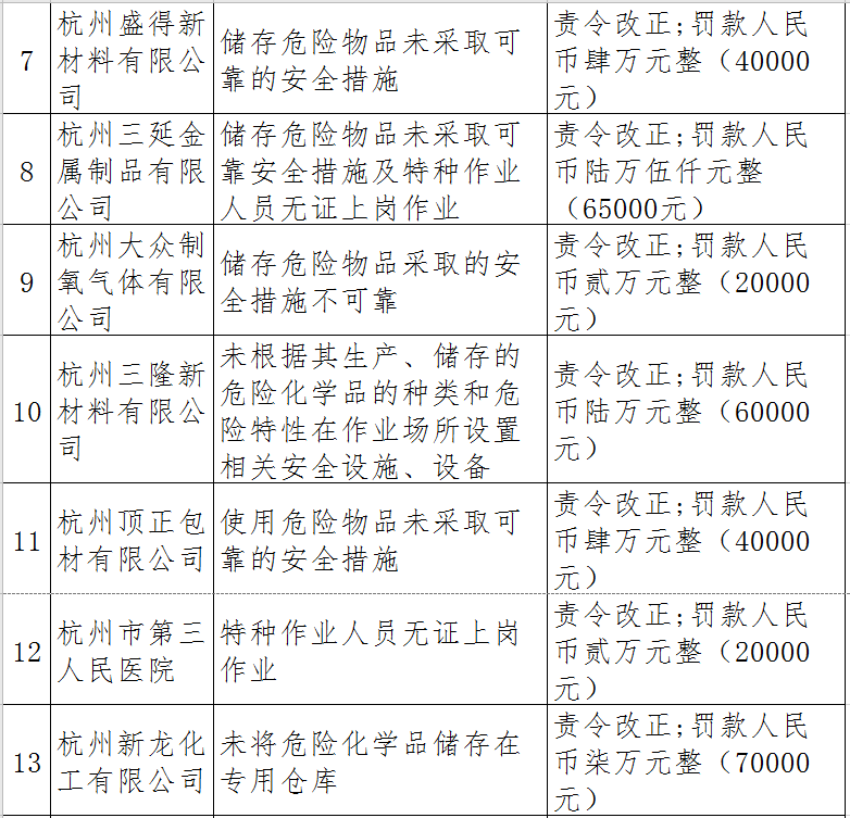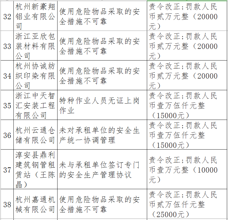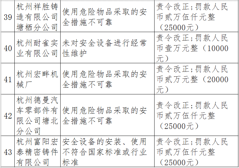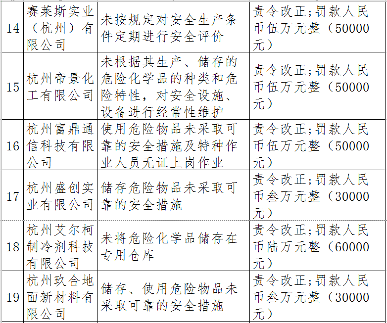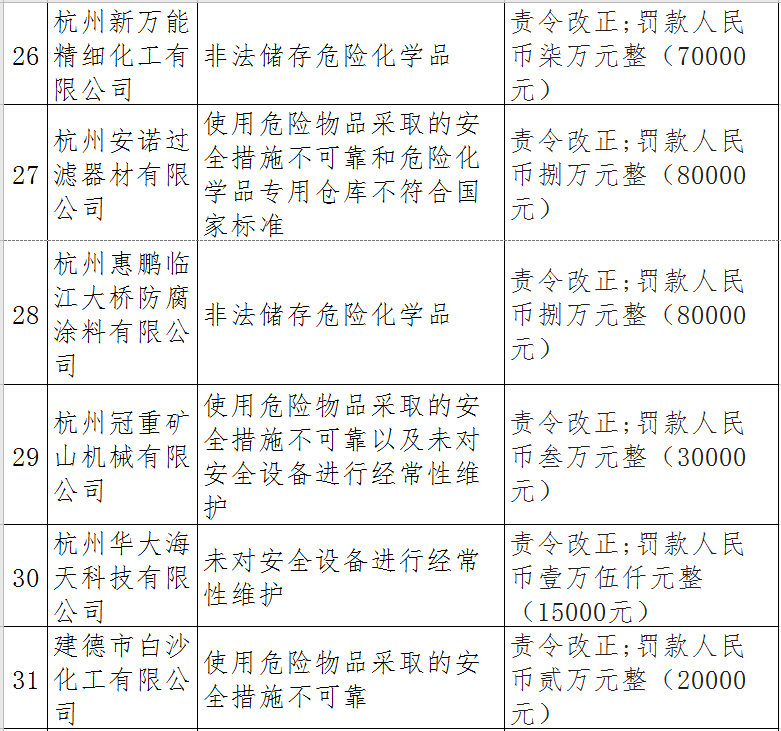 據(jù)了解,今年上半年,杭州市應(yīng)急管理局一手抓駐企復(fù)工復(fù)產(chǎn)、一手抓安全生產(chǎn),已完成年度執(zhí)法計劃、專項檢查、聯(lián)合執(zhí)法、信訪舉報核查等,并對檢查中發(fā)現(xiàn)的安全生產(chǎn)違法違規(guī)企業(yè)(個人)進行了處罰?,F(xiàn)對52家被行政處罰的企業(yè)(個人)進行曝光,希望各企業(yè)引以為戒!