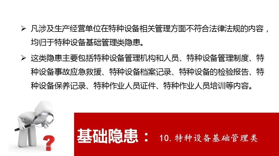 18 | 危險物品的容器、運(yùn)輸工具,以及涉及人身安全、危險性較大的海洋石油開采特種設(shè)備和礦山井下特種設(shè)備未經(jīng)具有專業(yè)資質(zhì)的機(jī)構(gòu)檢測、檢驗合格,取得安全使用證或者安全標(biāo)志,投入使用的 |