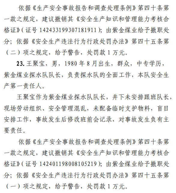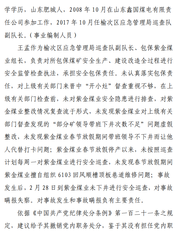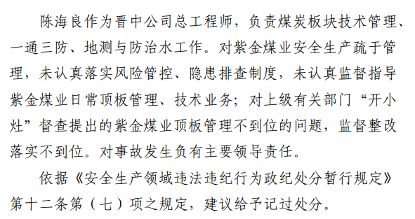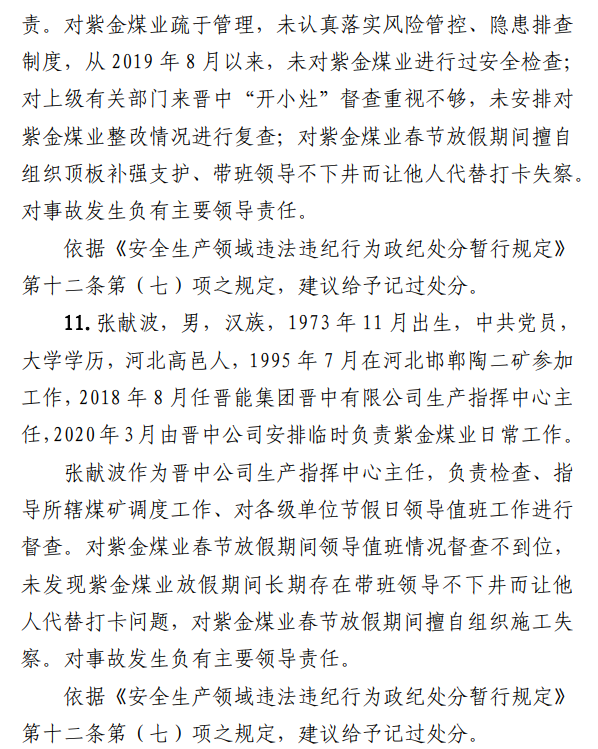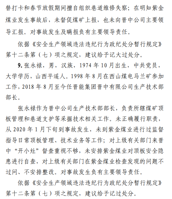 2月23日20時(shí)44分,探水隊(duì)副隊(duì)長王志平通過6103回風(fēng)順槽距開口950m處的電話,向礦調(diào)度室匯報(bào)了事故情況。20時(shí)46分,調(diào)度值班人員張宏強(qiáng)向礦長郭英杰匯報(bào)事故情況。郭英杰立即啟動應(yīng)急救援預(yù)案,組織煤礦相關(guān)人員開展搶險(xiǎn)救援工作。救援人員使用單體液壓支柱、半圓木、鉸接梁對事故地點(diǎn)外圍巷道進(jìn)行臨時(shí)支護(hù),然后由外到里清渣、支護(hù),實(shí)施救援。被冒落頂板埋壓的劉永生、馬練水和王秀國于2月24日14時(shí)30分、2月25日6時(shí)30分、2月25日14時(shí)分別被救出升井。經(jīng)醫(yī)生在井口確認(rèn),3人已無生命體征,之后被送往榆次區(qū)殯儀館,搶險(xiǎn)救援工作結(jié)束。事故瞞報(bào)、謊報(bào)經(jīng)過2月24日,礦長郭英杰安排信息中心主任梁煥修改人員定位系統(tǒng),關(guān)閉了工業(yè)視頻,刪除調(diào)度錄音通訊、虹膜數(shù)據(jù)。2月25日17時(shí)許,紫金煤業(yè)紀(jì)檢書記、黨總支副書記高建忠(臨時(shí)主持紫金煤業(yè)董事會及黨務(wù)日常事務(wù))和礦長郭英杰組織召開煤礦管理層會議。會上郭英杰、高建忠、紫金煤業(yè)安全生產(chǎn)技術(shù)總監(jiān)南海為了瞞報(bào)事故,對偽造出入井?dāng)?shù)據(jù)、修改人員定位數(shù)據(jù)、銷毀調(diào)度電話錄音、刪除視頻監(jiān)控資料、清理井下事故現(xiàn)場等事項(xiàng)進(jìn)行了安排。2月24日至25日,高建忠安排生產(chǎn)副礦長杜永忠、安全副礦長楊雙喜等人與遇難者家屬協(xié)商辦理賠償事宜,并安排遇難者家屬配合礦方瞞報(bào)事故。3月5日,在榆次區(qū)人民政府組織的核查過程中,郭英杰、高建忠均否認(rèn)事故發(fā)生,郭英杰、高建忠、南海繼續(xù)安排煤礦有關(guān)工作人員瞞報(bào)事故。3月8日上午9時(shí)許,在榆次區(qū)人民政府已查實(shí)事故、正在擬文上報(bào)的期間,紫金煤業(yè)向山西煤銷晉中公司、榆次區(qū)應(yīng)急管理局和晉中煤監(jiān)分局電話匯報(bào)事故,稱三名巡檢人員走到事故地點(diǎn)時(shí),頂板突然冒落導(dǎo)致事故發(fā)生,謊報(bào)了事故的經(jīng)過和原因。2月23日22時(shí)左右,武全珍在井下安排王家偉完善措施內(nèi)容。王家偉出井后在措施中增加了:“頂板較完整區(qū)域補(bǔ)強(qiáng)支護(hù)期間采用單體支柱+鉸接頂梁做臨時(shí)支護(hù),頂板不平整處使用方木墊平、木楔背緊背實(shí)”,和“臨時(shí)支護(hù)安全技術(shù)措施”相關(guān)內(nèi)容。2月24日上午,武全珍安排王家偉在該措施中增加了“絞車運(yùn)輸安全技術(shù)措施”和“移動乳化液泵使用安全技術(shù)措施”等內(nèi)容。3月8日,生產(chǎn)礦長杜永忠安排探水隊(duì)隊(duì)長王聚寶在班前會記錄中加上“先抽400米水”。當(dāng)天晚上,安全礦長楊雙喜在在班前會記錄中加上“不準(zhǔn)進(jìn)尺,打好臨時(shí)支護(hù)再作業(yè)”等內(nèi)容。現(xiàn)場人員在無臨時(shí)支護(hù)的情況下違章進(jìn)行補(bǔ)強(qiáng)支護(hù)作業(yè),施工過程中頂板失穩(wěn)冒落,導(dǎo)致事故發(fā)生。1.紫金煤業(yè)對處于極限平衡狀態(tài)的6103回風(fēng)順槽頂板存在的安全隱患辨識不清、安全風(fēng)險(xiǎn)管控不力6103回風(fēng)順槽巷道埋深大、圍巖較軟,且為迎采對掘巷道,受臨近的6101工作面開采動壓影響大,多根錨桿錨索斷裂失效,巷道變形,底板鼓起,事故地點(diǎn)附近巷道頂板已處于高應(yīng)力的極限平衡狀態(tài)。事故發(fā)生前,事故地點(diǎn)附近巷道頂板已先后發(fā)生兩次冒落。紫金煤業(yè)對6103回風(fēng)順槽頂板存在的安全隱患辨識不清、重視不夠,未切實(shí)進(jìn)行礦壓日常監(jiān)測分析,未對斷裂失效錨桿及時(shí)補(bǔ)強(qiáng)支護(hù),施工時(shí)未采取臨時(shí)支護(hù),安全風(fēng)險(xiǎn)管控不力。2.紫金煤業(yè)技術(shù)管理工作有漏洞,《6103回風(fēng)順槽補(bǔ)強(qiáng)支護(hù)施工安全技術(shù)措施》對現(xiàn)場作業(yè)指導(dǎo)性差紫金煤業(yè)編制的《6103回風(fēng)順槽補(bǔ)強(qiáng)支護(hù)施工安全技術(shù)措施》對巷道補(bǔ)強(qiáng)支護(hù)作業(yè)的臨時(shí)支護(hù)形式、技術(shù)參數(shù)和要求不具體,對現(xiàn)場作業(yè)指導(dǎo)性差。生產(chǎn)技術(shù)科科長王家偉編制措施前未到6103回風(fēng)順槽實(shí)地查看頂板情況,生產(chǎn)礦長杜永忠、安全礦長楊雙喜、總工程師武全珍及相關(guān)部門負(fù)責(zé)人會審措施時(shí)審查把關(guān)不嚴(yán),措施僅由探水隊(duì)隊(duì)長在班前會進(jìn)行宣讀,學(xué)習(xí)貫徹不到位。3.6103回風(fēng)順槽補(bǔ)強(qiáng)支護(hù)作業(yè)勞動組織混亂,現(xiàn)場安全監(jiān)管缺位事故當(dāng)班,在探水隊(duì)隊(duì)長提出本隊(duì)人員不熟悉支護(hù)作業(yè)的情況下,礦領(lǐng)導(dǎo)違章指揮,仍然抽調(diào)安監(jiān)科和探水隊(duì)人員進(jìn)行支護(hù)作業(yè)。作業(yè)人員安全風(fēng)險(xiǎn)辨識能力不足,安全意識淡薄。事故當(dāng)班無帶班礦領(lǐng)導(dǎo)和跟班隊(duì)長,未設(shè)專職安監(jiān)員,現(xiàn)場安全監(jiān)管缺位。4.紫金煤業(yè)礦領(lǐng)導(dǎo)帶班下井制度形同虛設(shè)礦長郭英杰安排春節(jié)放
