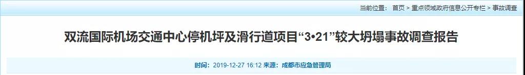 經(jīng)調(diào)查認(rèn)定,雙流國際機(jī)場交通中心停機(jī)坪及滑行道項(xiàng)目“3·21”坍塌事故是一起生產(chǎn)安全責(zé)任事故,事故等級(jí)為較大事故。