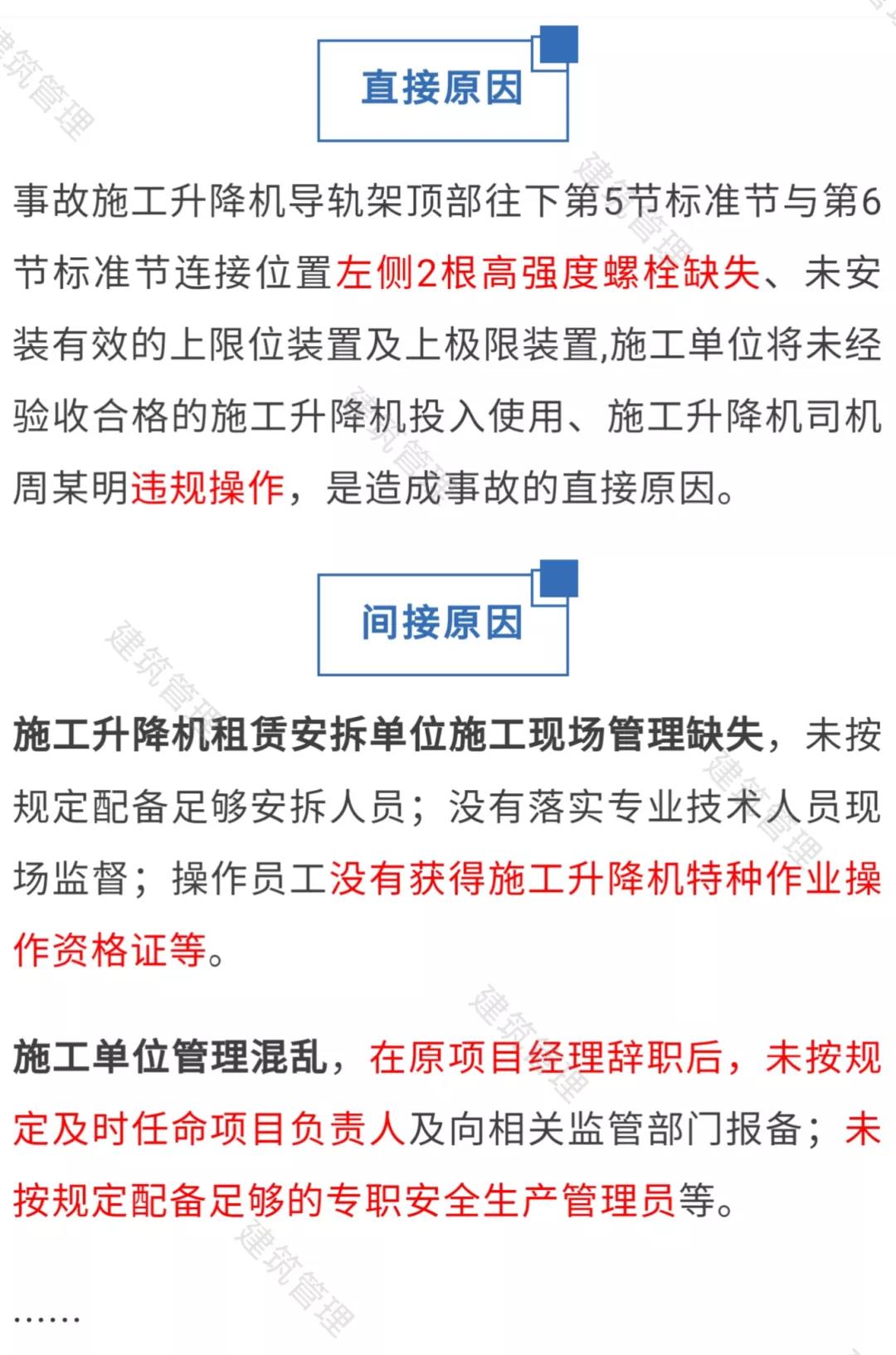 2.廣東龍越建筑工程有限公司(施工單位)。作為項目工程的承建單位,管理混亂,在原項目經(jīng)理潘永兵辭職后,未按規(guī)定及時任命項目負責人及向相關監(jiān)管部門報備;未按規(guī)定配備足夠的專職安全生產(chǎn)管理員;未督促落實專職設備管理人員張小龍、專職安全生產(chǎn)管理員吳俊霖按規(guī)定對施工升降機頂升加節(jié)進行現(xiàn)場監(jiān)督檢查;未按規(guī)定組織安拆、監(jiān)理等有關單位對施工升降機頂升加節(jié)操作后進行驗收及出具驗收記錄,就違規(guī)投入使用。