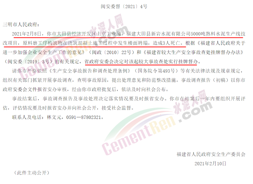 據(jù)水泥人網(wǎng)了解,福建省應(yīng)急管理廳發(fā)布較大生產(chǎn)安全事故查處掛牌督辦通知書(shū)(三明大田2.8水泥技改項(xiàng)目施工過(guò)程樓面坍塌事故)稱,2021年2月8日,三明市大田縣經(jīng)濟(jì)開(kāi)發(fā)區(qū)上京工業(yè)園,福建大田縣新巖水泥有限公司5000噸熟料水泥生產(chǎn)線技改項(xiàng)目,原料磨工序構(gòu)筑物在澆筑混凝土施工過(guò)程中發(fā)生樓面坍塌,造成3人死亡。 依據(jù)有關(guān)規(guī)定,福建省政府安委會(huì)決定對(duì)該起較大事故查處實(shí)行掛牌督辦。
