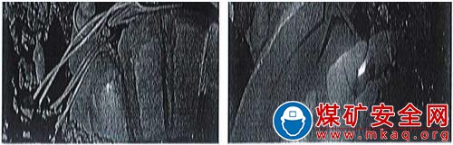 采煤機(jī)前滾筒在工作面中間巷巷口中部,外露部分有7處損壞截齒座和截齒;后滾筒在溜尾方向距中間巷10m處,后滾筒上纏繞有錨索(見(jiàn)圖4)。