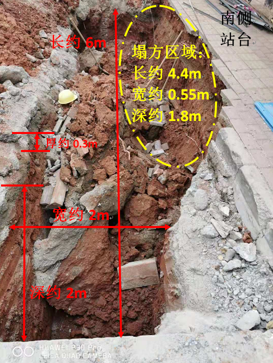 溝槽南側(cè)惠豐城公交站臺(tái)鋪磚區(qū)下方基坑側(cè)壁有坍塌現(xiàn)象,塌方長(zhǎng)度約為4.4m,寬度約0.55m,深度約1.8m,溝槽北側(cè)龍海二路硬化路面處完好。(見(jiàn)圖二)