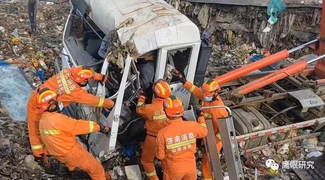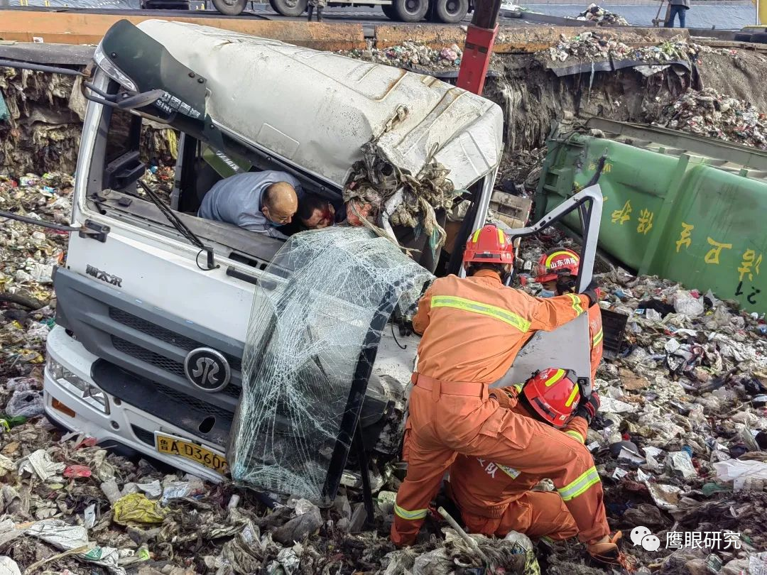 山東濟南:一垃圾車倒垃圾墜入垃圾池
