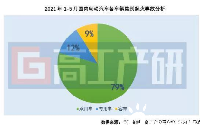 從各事故發(fā)生的動力類型來看,2021年1-5月純電動車型依然是起火事故占比最大的車型。