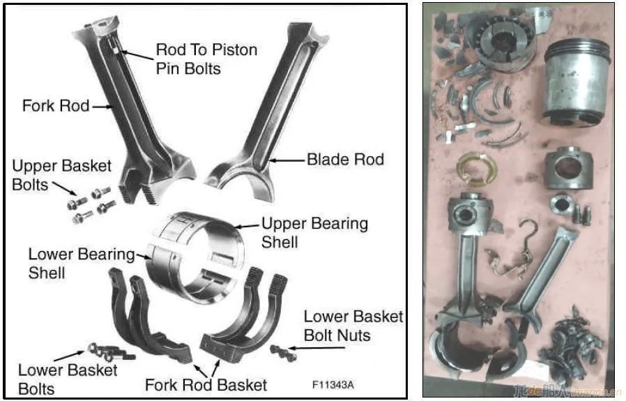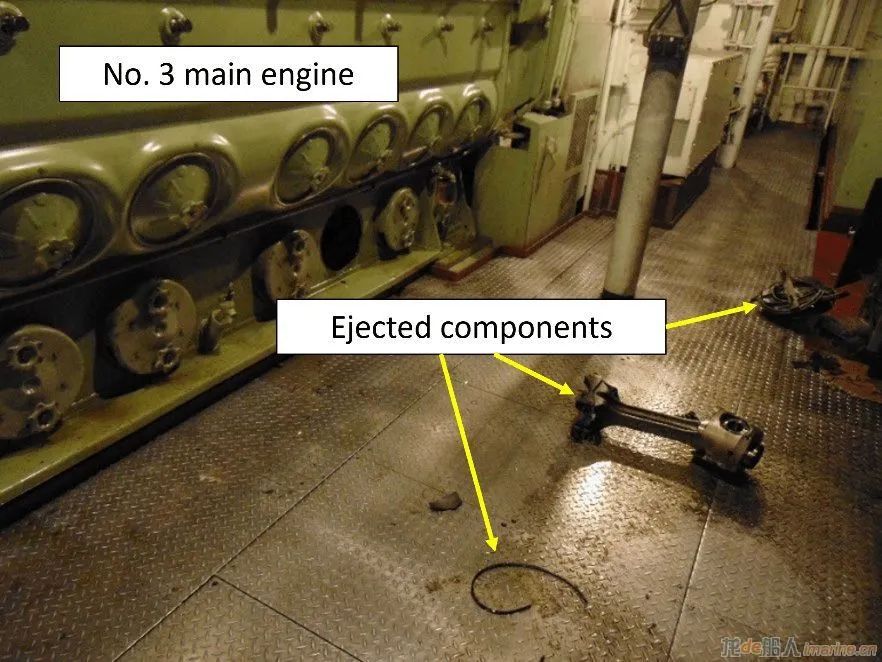 在檢查中,工程師發(fā)現(xiàn)6號曲柄銷(用于6號和14號氣缸)的連桿和活塞處于“完全損壞狀態(tài)”。在油底殼中發(fā)現(xiàn)曲柄總成托架的一個完整螺栓,同時在另外一處發(fā)現(xiàn)了緊固螺母,這證明螺栓和螺母是在運行過程中脫落的??偝傻钠渌菟ň捎诶爝^度而發(fā)生變形及斷裂。