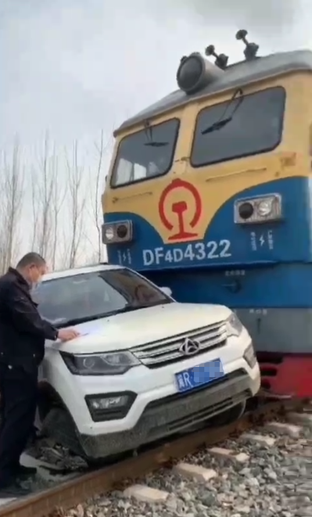 據(jù)網(wǎng)傳視頻顯示,一輛車牌為“冀R”開頭的白色SUV,與一列藍(lán)黃車頭的貨運(yùn)火車相撞后,橫停在鐵路中間,白色汽車駕駛座后座的車門已凹陷變形,周圍有不少圍觀群眾。